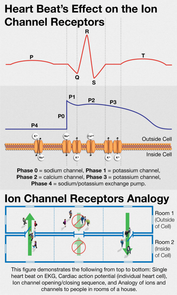 It can be helpful to think of the electrical system of the heart as a house with people moving in and out of multiple rooms and doorways connected to each other. We can use the following analogy: the house is the electrical system, the rooms are the heart’s electrical cells, the doorways are ion channel receptors, and the people are electrolyte ions that move through the ion channel receptors. An ion channel is a protein located on the cell membrane which controls the movement of sodium, potassium, magnesium, and calcium. This movement generates electrical fields that create the heartbeat.